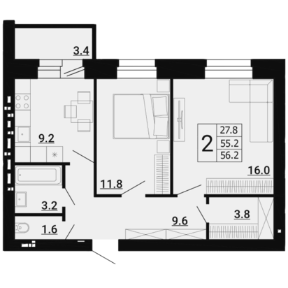 2-комнатная квартира, 56.2 кв.м.